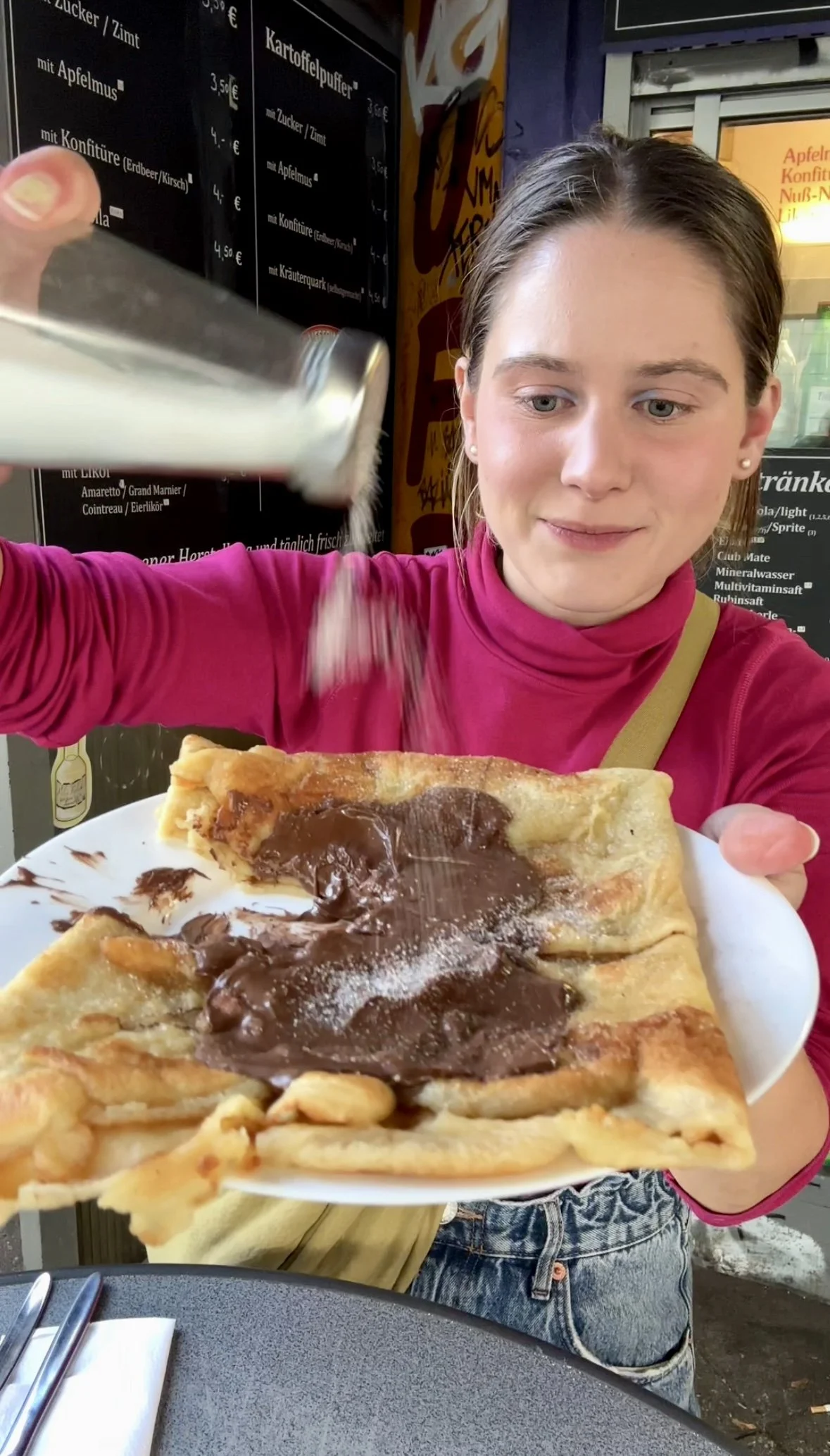 Auch dieser Imbiss ist eine Legende: der Pufferimbiss am Hermannplatz bietet seit fast 40 Jahren frische Kartoffelpuffer und Eierkuchen an. Ich liebe die Eierkuchen (nicht nur, weil sie ca 1m lang sind), weil sie etwas dicker sind und man sie mit Schokocreme bestreichen lassen kann. Extra Bonus: Auf jeden Tisch steht eine Flasche mit Zucker und man kann sich nach Gusto bedienen.